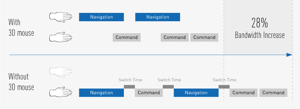 การใช้ SpaceMouse ร่วมกับ เมาส์ แบบการทำงานสองมือตามภาพด้านล่าง จะทำให้เพิ่มประสิทธิภาพ และความรวดเร็วในการทำงานโดยเฉลี่ย ประมาณ 20 เปอร์เซ็นต์ เมื่อเทียบกับการทำงานแบบใช้เมาส์มือเดียวตามภาพด้านล่างส่วนบน