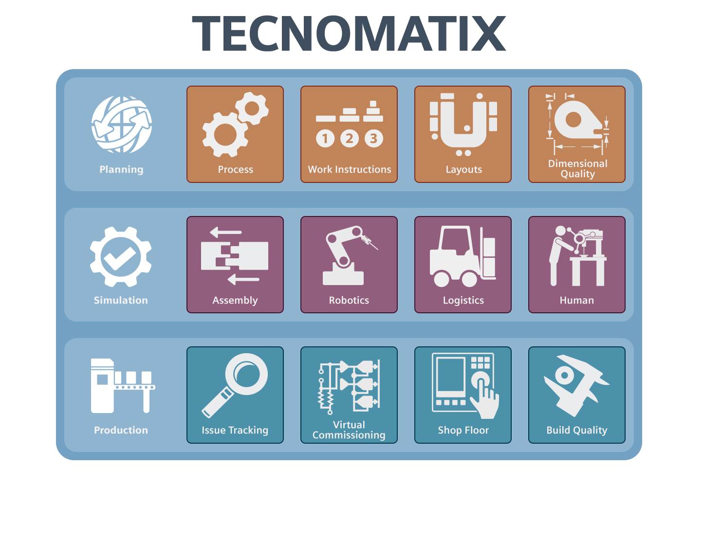 เป็นชุดผลิตภัณฑ์ที่ครอบคลุมโซลูชั่นด้านการผลิตแบบดิจิทัล ซึ่งจะช่วยให้คุณเข้าถึงนวัตกรรม ด้วยการทำงานแบบ Synchronizing Product Engineering, Manufacturing Engineering และ Production สนับสนุนการทำงานได้ดีที่สุดบนแพลตฟอร์ม Teamcenter Manufacturing PLM ทำให้ Tecnomatix เป็นโซลูชันด้านการผลิตที่หลากหลายที่สุดในตลาดของยุคอุตสาหกรรม 4.0 โดยมีการแบ่งการสนับสนุนหลักไว้ สามส่วนหลักดังต่อไปนี้